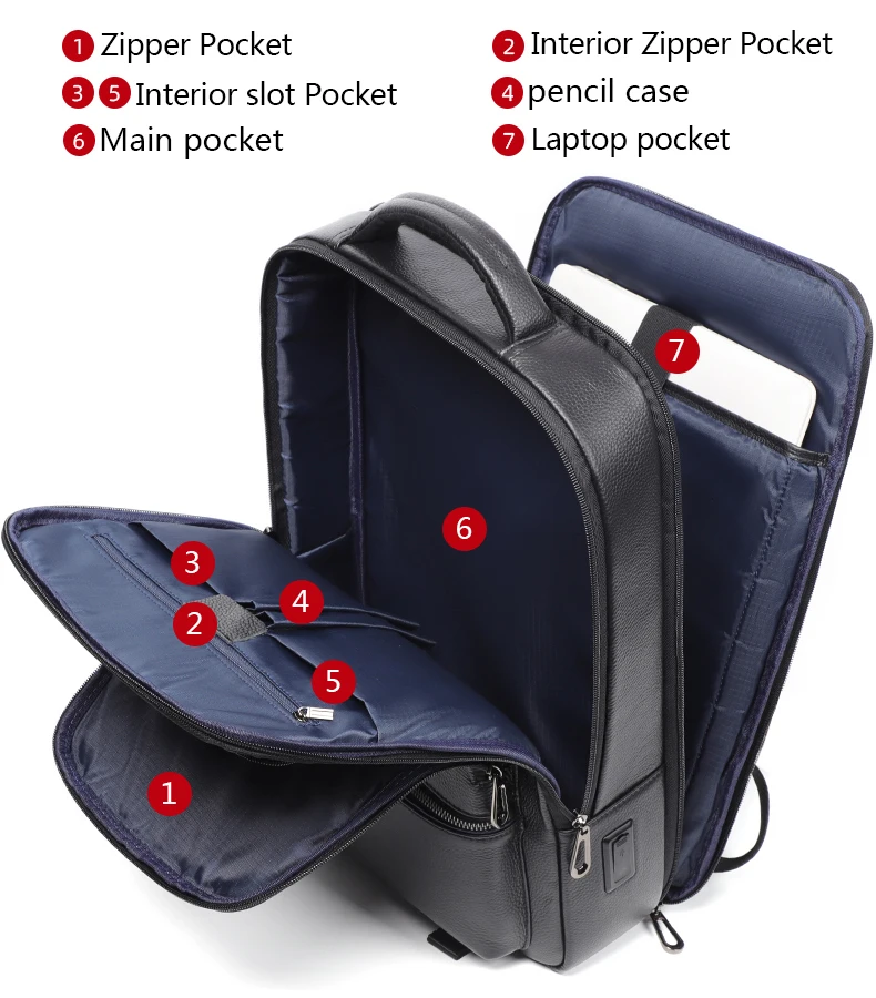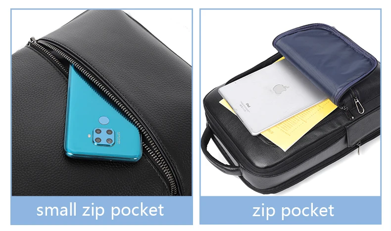 Bolsos internos para celular, zíper interno, compartimento para computador e divisórias funcionais.